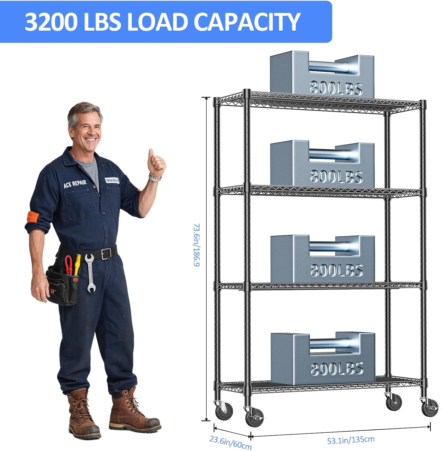 - COMMERCIAL-GRADE HEAVY DUTY β Built with premium carbon steel and 25.4mm thick metal rods, each shelf supports up to 660 lbs on leveling feet, with a total capacity of 2200 lbs (approx. 530 lbs on wheels). Perfect for heavy-duty storage needs.