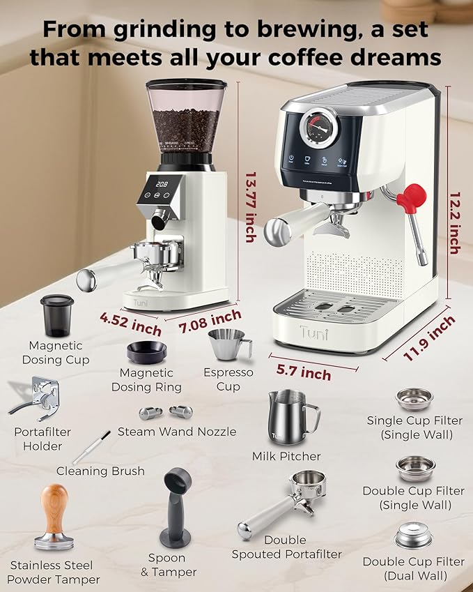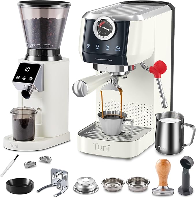 Tuni E2 𝑬𝒔𝒑𝒓𝒆𝒔𝒔𝒐 𝑴𝒂𝒄𝒉𝒊𝒏𝒆 with G1 𝑪𝒐𝒏𝒊𝒄𝒂𝒍 𝑪𝒐𝒇𝒇𝒆𝒆 𝑮𝒓𝒊𝒏𝒅𝒆𝒓 Combo Set, 20Bar 58mm Dual Boiler Coffee Maker, 48 Grinding Settings Burr Mill