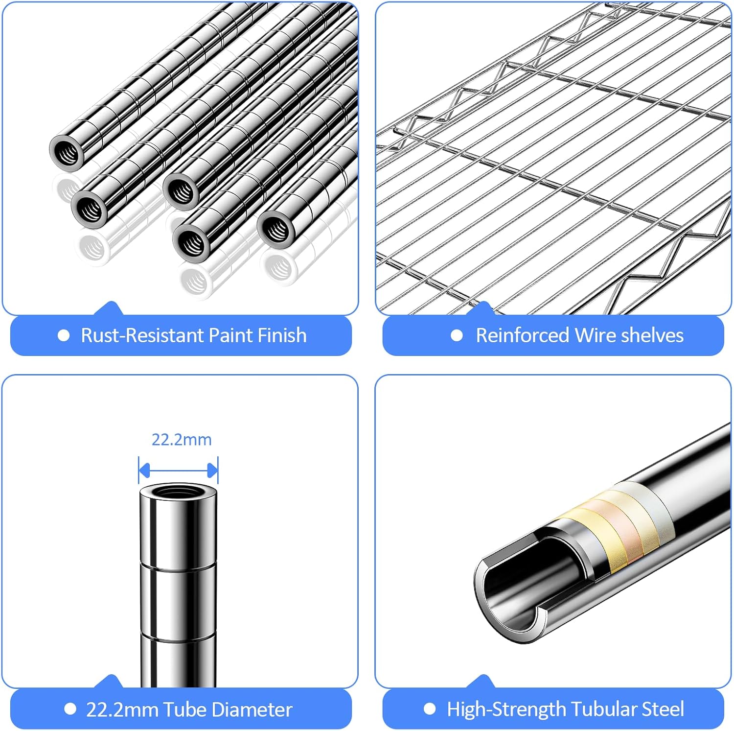 - ăAdjustable Shelves â Flexible for All NeedsăCustomize your storage your way. Each shelf can be easily adjusted in 1-inch increments to fit items of varying sizesâfrom bulky tools to compact kitchenware. This wire shelving unit adapts to your unique storage needs, creating a more organized and efficient space.